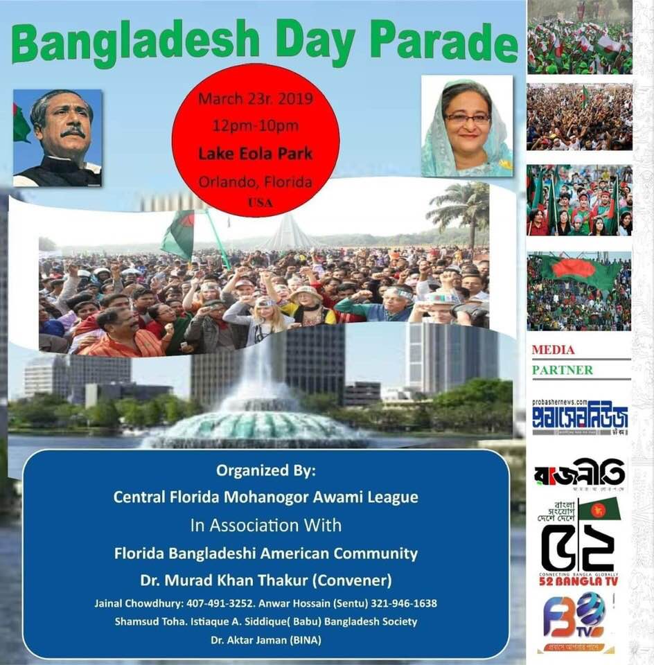 সেন্ট্রাল ফ্লোরিডায় প্রথম বারের মতো বাংলাদেশ ডে পেরেড আয়োজনের উদ্যোগ নেওয়া হয়েছে। আগামী ২৩ মার্চ এই প্যারেড অনুষ্ঠিত হবে।