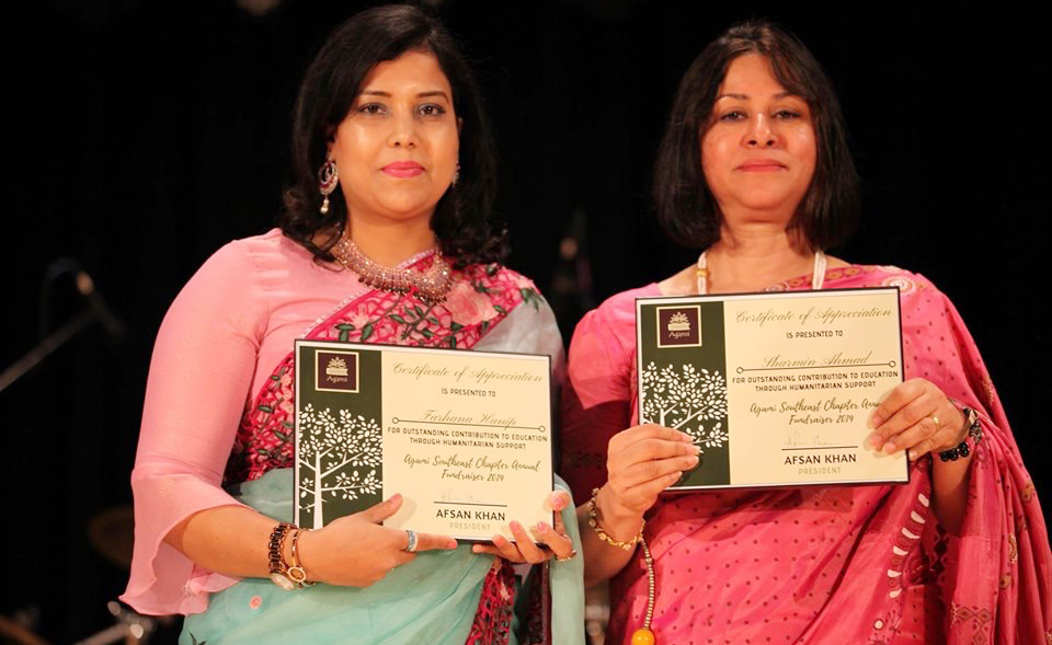 শিক্ষা ও আর্থ-সামাজিক ক্ষেত্রে বিশেষ অবদান এবং নারীর ক্ষমতায়নের জন্য যুক্তরাষ্ট্রের দুই নারী ব্যক্তিত্বকে সম্মাননা প্রদান করেছে ওয়াশিংটন ডিসি ও ভার্জিনিয়ার সামাজিক সংগঠন আগামী সাউথইস্ট চ্যাপ্টার। শনিবার ভার্জিনিয়ার আলেকজান্দ্রিয়ায় লী সেন্টারের রিচার্ড কফম্যান অডিটোরিয়ামে অনুষ্ঠিত ফান্ড রাইজিং কনসার্টে বাংলাদেশের প্রথম প্রধানমন্ত্রী তাজউদ্দীন আহমদের জ্যেষ্ঠ কন্যা শিক্ষাবিদ ও লেখক শারমিন আহমদ রিপি এবং যুক্তরাষ্ট্রে বাংলাদেশি মালিকানাধীন সর্ববৃহৎ আইটি শিক্ষা প্রতিষ্ঠান পিপল এন টেকের প্রেসিডেন্ট, নারী উদ্যোক্তা ফারহানা হানিপের হাতে সম্মাননা তুলে দেন সংগঠনের প্রেসিডেন্ট আফসান খান।