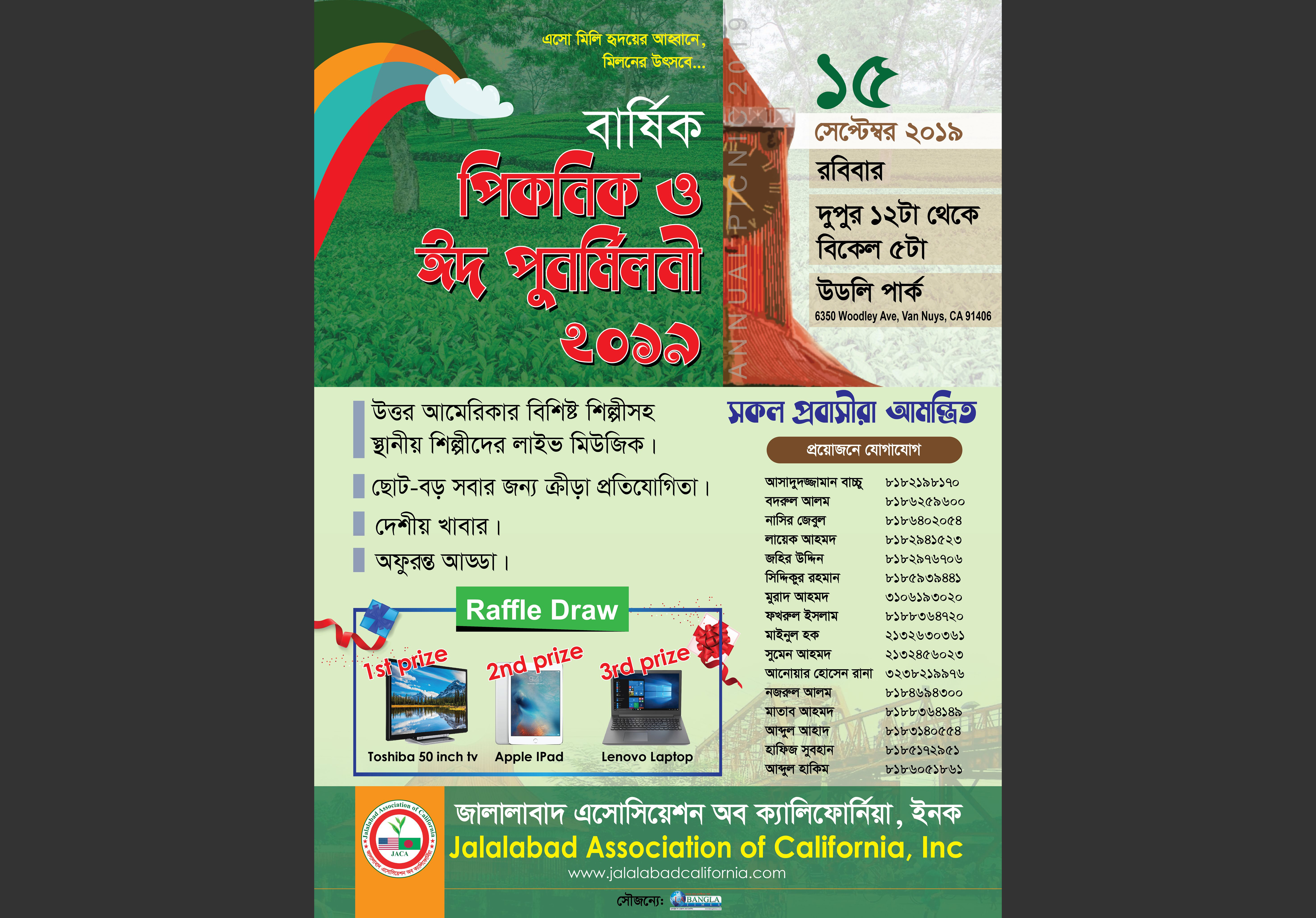 আগামী রবিবার (১৫ সেপ্টেম্বর) ক্যালিফোর্নিয়ার ভেন নাইস সিটির উডলি পার্কে (6350 Woodley Ave, Van Nuys, CA 91406) বৃহত্তর সিলেটিদের সংগঠন ‘জালালাবাদ এসোসিয়েশন অব ক্যালিফোর্নিয়া’র বার্ষিক পিকনিক ও ঈদ পুনর্মিলনী অনুষ্ঠিত হবে। প্রতি বছর ক্যালিফোর্নিয়ায় এই আয়োজন করে থাকে সংগঠনটি।
