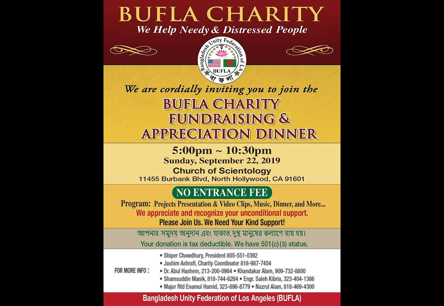আগামী রবিবার (২২ সেপ্টেম্বর) অনুষ্ঠিত হবে বাংলাদেশ ইউনিটি ফেডারেশন অব লস এঞ্জেলেস (বাফলা)-এর চ্যারিটি ইউনিটের বার্ষিক ফান্ডরাইজিং ও এপ্রিসিয়েশন ডিনার। নর্থ হলিউডের চার্চ অব সাইন্টিলজিতে (Church of Scientology, 11455 Burbank Blvd, North Hollywood, CA 91601) বিকেল ৫টা থেকে রাত সাড়ে ১০টা পর্যন্ত চলবে এই অনুষ্ঠান।