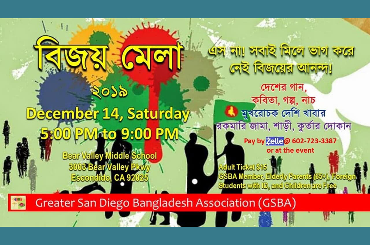 গ্রেটার সান দিয়াগো বাংলাদেশ এসোসিয়েশন-এর উদ্যোগে এক বিজয় মেলার আয়োজন করা হয়েছে। আগামী শনিবার (১৪ ডিসেম্বর) বিয়ার ভ্যালি মিডল স্কুলে (3003 Bear Valley Pkwy Escondido, CA 92025) বিকেল ৫টা থেকে রাত ৯টা পর্যন্ত এই অনুষ্ঠানে থাকবে দেশের গান, কবিতা, গল্প, নৃত্য, মুখরোচক দেশি খাবার ও রকমারি কাপড়ের দোকান।