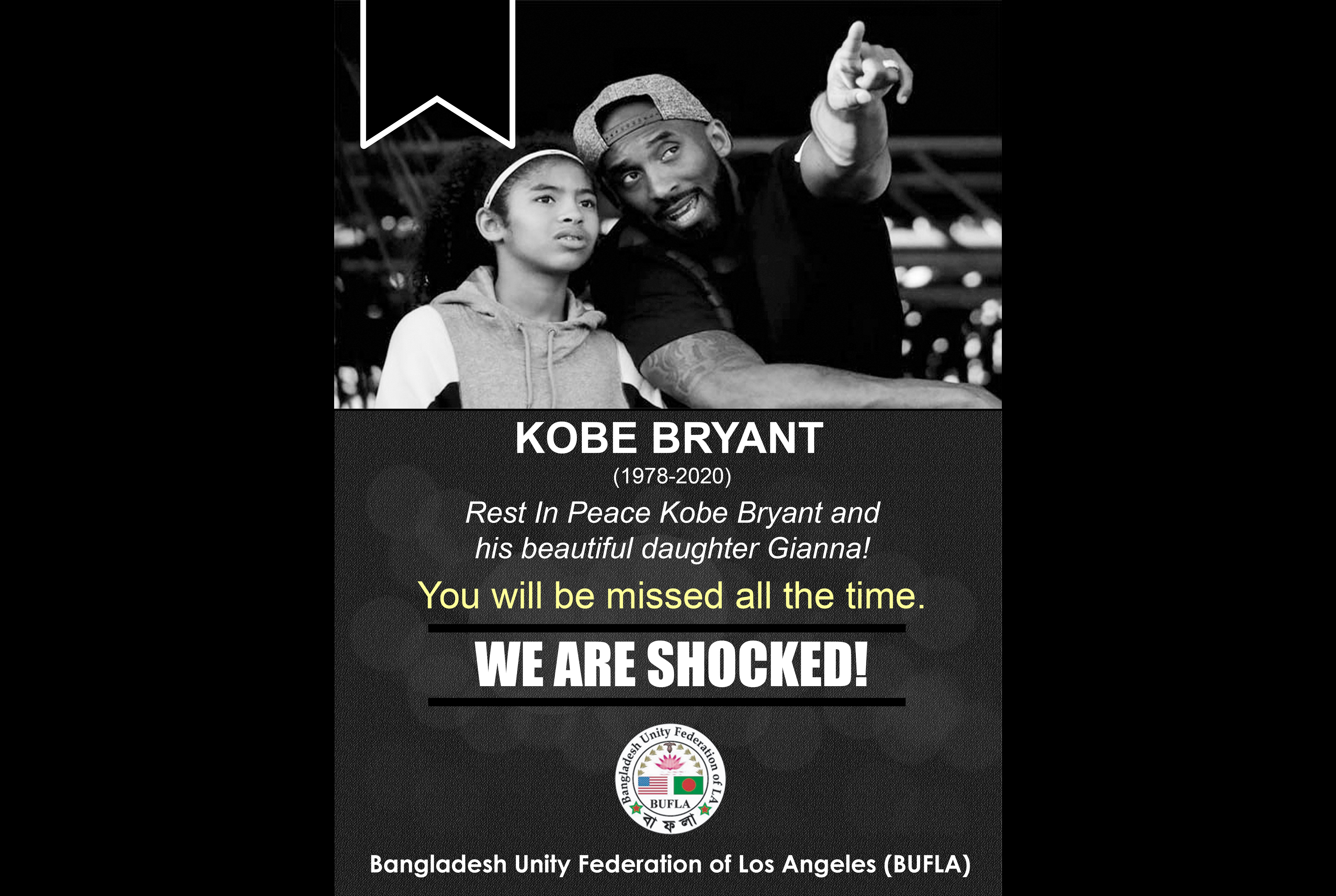 মার্কিন যুক্তরাষ্ট্রের কিংবদন্তি বাস্কেটবল খেলোয়াড় কোবে ব্রায়ান্টের মৃত্যুতে গভীর শোক প্রকাশ করেছেন বাংলাদেশ ইউনিটি ফেডারেশন অব লস এঞ্জেলেস (বাফলা) নেতৃবৃন্দ। বাফলা প্রেসিডেন্ট শিপার চৌধুরী ও সেক্রেটারি আঞ্জুমান আরা শিউলি স্বাক্ষরিত এক শোক বার্তায় নেতৃবৃন্দ এই শোক জানান। পাবলিক রিলেশন সেক্রেটারি আব্দুস সামাদের পাঠানো শোক বার্তায় নেতৃবৃন্দ কোবে ব্রায়ান্টের আত্মার শান্তি কামনা করেন।