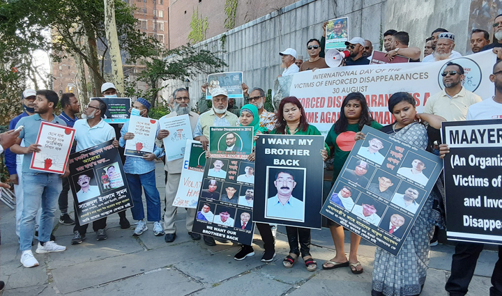 আন্তজাতিক গুম খুন প্রতিরোধ দিবস উপলক্ষ্যে নিউইয়র্কে জাতিসংঘের সামনে বিক্ষোভ সমাবেশ করেছেন প্রবাসী বাংলাদেশীরা। সমাবেশ থেকে বাংলাদেশে গুম হওয়া স্বজনদের ফিরিয়ে দেওয়ার পাশাপাশি মানবাধিকার লঙ্ঘন সহ সরকারের বিভিন্ন সমালোচনা করে শেখ হাসিনা সরকারের পদত্যাগ দাবী করা হয়। মঙ্গলবার (৩০ আগষ্ট) অপরাহ্নে জাতিসংঘ ভবনের সামনে ফাস্ট এভিনিউ ও ৪৩ স্ট্রীটস্থ পার্কে এই সমাবেশের আয়োজন করা হয়। বিকেল ৪টা থেকে ৫টা পর্যন্ত চলে এই সমাবেশ। উল্লেখ্য, জাতিসংঘে পুলিশ প্রধানদের সম্মেলন চলাকালে এই বিক্ষোভ সমাবেশ অনুষ্ঠিত হয়। পুলিশ প্রধানদের সম্মেলনে বাংলাদেশ দলের নেতৃত্বে দিচ্ছেন স্বরাষ্ট্রমন্ত্রী আসাদুজ্জামান কামাল। তার সাথে আইজিপি ড. বেনজীর আহমদ সহ অন্যান্য কর্মকর্তারা উপস্থিত ছিলেন।