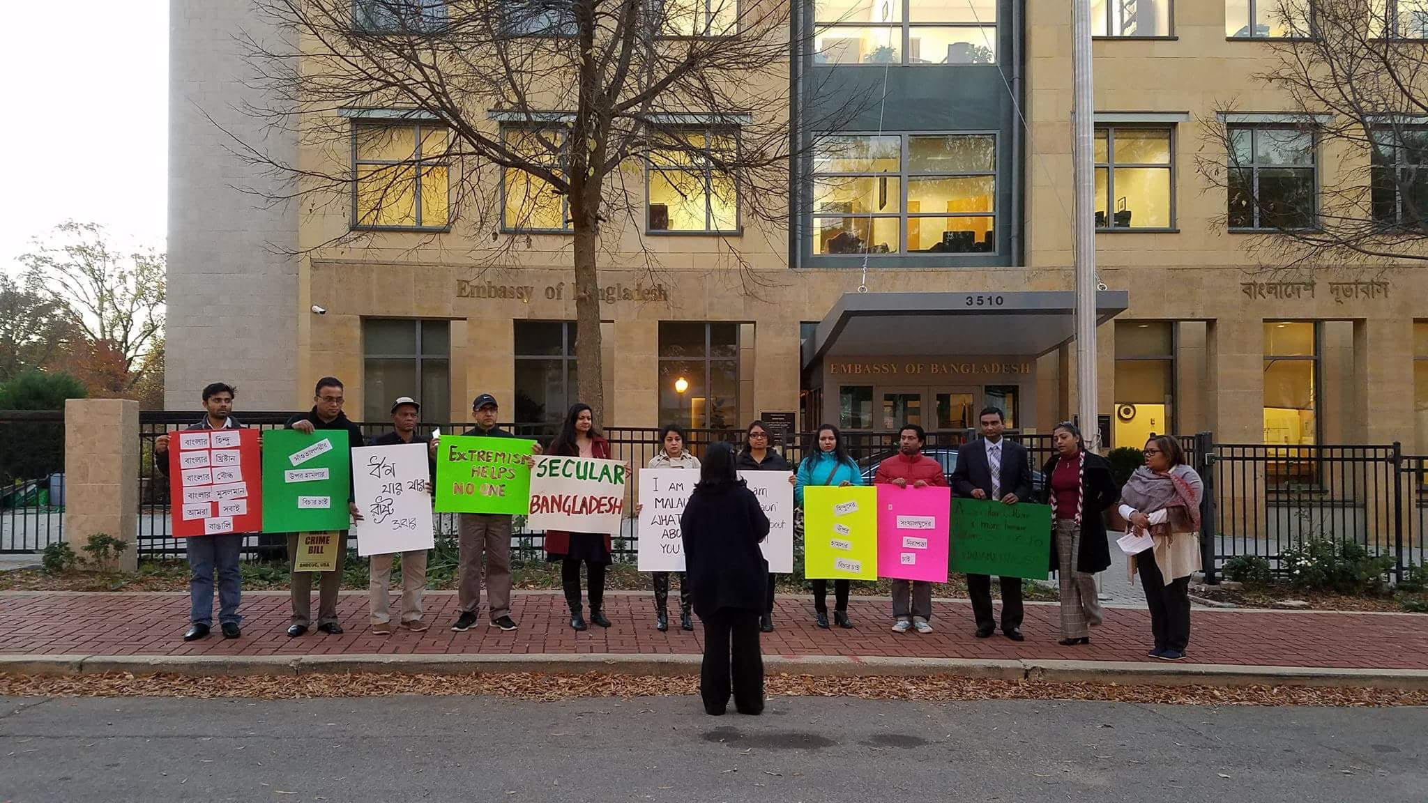 গত ১১ নভেম্বর বৃহস্পতিবার বৃহত্তর ওয়াশিংটন ডিসির প্রবাসী বাংলাদেশীরা "দৃষ্টিপাত ডিসি" সংগঠনের ডাকে সাম্প্রতিক সময়ে ব্রাম্মনবাড়িয়ায় হিন্দুদের উপর এবং গাইবান্ধায় সাঁওতাল পল্লীতে হামলার প্রতিবাদে বাংলাদেশ দুতাবাসের সামনে মানববন্ধনের জন্য একত্রিত হয়। সংখ্যালঘুদের উপর হামলার নিন্দা জানিয়ে এবং হামলাকারীদের উপযুক্ত শাস্তির আবেদন জানিয়ে একটি পিটিশন দূতাবাস কর্তৃপক্ষকে দেয়া হয়। তৌফিক হাসান, নাদিয়া আফরিন এবং শিমুল মৌ ফেইসবুকের মাধ্যমে এই ইভেন্টটি আয়োজন করেন।