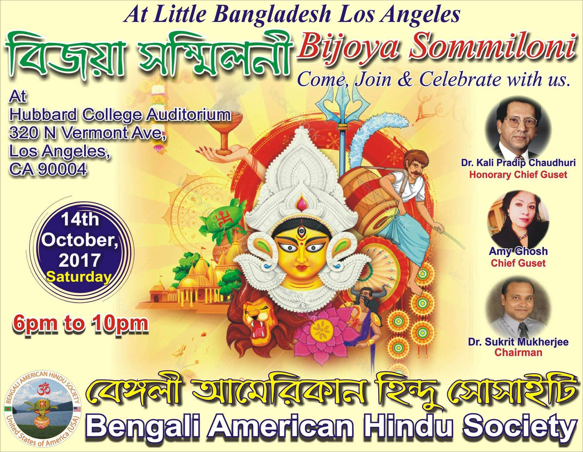 সম্প্রতি শেষ হওয়া শারদীয় দুর্গাপূজায় সহযোগিতাকারী শিল্পী, উপস্থাপক, স্পন্সর, সংগঠনের নেতৃবৃন্দ ও অতিথিদের সম্মানে লস এঞ্জেলেসে বিজয়া সম্মিলনী আয়োজন করেছে বেঙ্গলী আমেরিকান হিন্দু সোসাইটি।