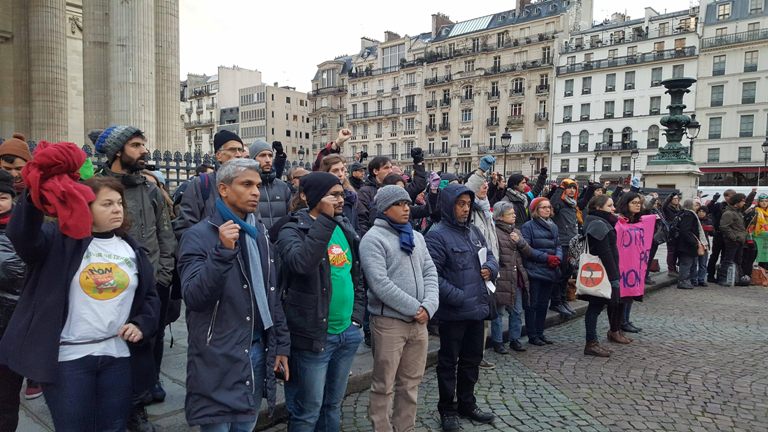 প্রতিবাদ কর্মসুচীর ধারাবাহিকতায় গত ১২ ডিসেম্বর সকালে আন্দোলনকারীরা এক প্রতিবাদ সমাবেশের আয়োজন করে। স্থানীয় সময় সকাল ৮ টায়,প্যারিসের প্লেস দু পন্থেওন পার্কে ফ্রান্স সরকারের সকল বাঁধা উপেক্ষা করে ইউরোপীয় পরিবেশবাদী সংগঠনের অংশগ্রহণে একটি প্রতিবাদ সমাবেশ অনুষ্ঠিত হয়। প্রায় ৮০০ জনের এই প্রতিবাদ কর্মসূচিতে উপস্হিত প্রতিবাদী জনতা বিশাল কালো চাদর (কয়লা) দিয়ে পৃথিবীকে প্রথমে আবৃত করে, এরপর সে চাদর ছিন্নভিন্ন করে জনতা মুক্ত বাতাসে বের হয়ে আসে এবং মুক্তির গান গেয়ে ও শ্লোগান দিয়ে বিশ্বকে পরিবেশ রক্ষায় এগিয়ে আসতে বলে। এতে কয়লার রূপক অর্থে কালো চাদর দিয়ে পৃথিবীকে প্রথমে ঢেকে ফেলা হয়, এরপর প্রতিবাদী জনতা সে চাদর ছিন্নভিন্ন করে মুক্ত বাতাসে বের হয়ে আসে এবং মুক্তির গান গেয়ে ও শ্লোগান দিয়ে বিশ্বকে পরিবেশ রক্ষায় এগিয়ে আসতে বলে।