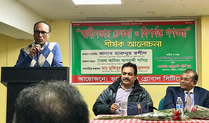 নিউইয়র্কে ভয়েস অব গ্লোবাল সিটিজেন আয়োজিত ‘স্বাধীনতার চেতনা ও বিপর্যস্ত গণতন্ত্র’ শীর্ষক এক সভায় কেন্দ্রীয় বিএনপি’র যুগ্ম মহাসচিব ও সাবেক এমপি হারুনুর রশীদ বলেছেন, বাংলাদেশ, দেশের মানুষ ভালো নেই। সত্যিকারই দেশ বিপর্যস্ত। শেখ হাসিনার আওয়ামী লীগ সরকারের শোষণ, জুলুম, অত্যাচার, নির্যাতন, গুম, খুন ৯০ দশকের স্বৈরাচারী এরশাদের শাসনকেও হার মানিয়েছে। আওয়ামী লীগ সরকার গণতন্ত্রকে হত্যা করে শেখ মুজিবের মতো একদলীয় শাসন কায়েম করেছে। তিনি বলেন, বাংলাদেশের স্বাধীনতার ঘোষক, বহুদলীয় গণতন্ত্রের প্রবর্তক, শহীদ রাষ্ট্রপতি জিয়াউর রহমান দেশে গণতন্ত্র প্রতিষ্ঠা করেছিলেন। তার যোগ্য উত্তরসূরী সাবেক প্রধানমন্ত্রী বেগম খালেদা জিয়ার নেতৃত্বেই আবার বাংলাদেশে গণতন্ত্র প্রতিষ্ঠা হবে।
