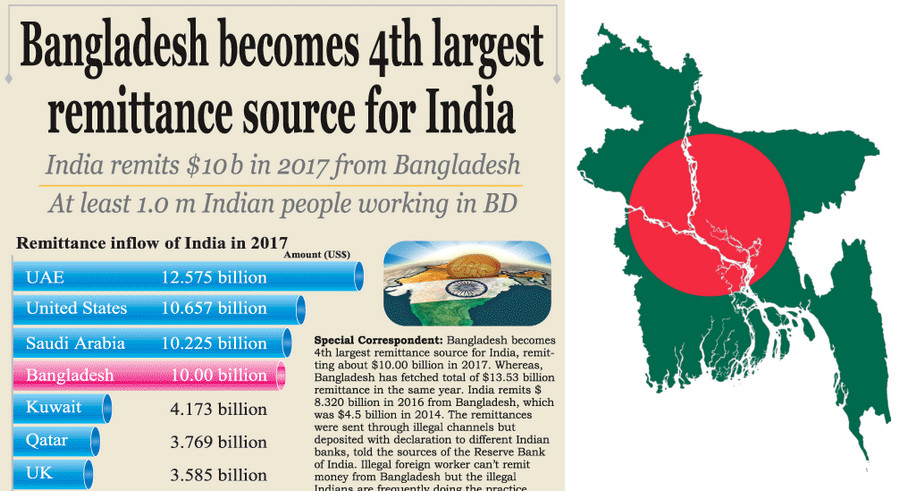 বাংলাদেশ থেকে ভারত বছরে চার বিলিয়ন ডলার বা ৩৩ হাজার কোটি টাকা রেমিট্যান্স আয় করছে। ভারত বিশ্বের যেসব দেশ থেকে রেমিট্যান্স আয় করে তার তালিকায় বাংলাদেশের স্থান পঞ্চম। এ খবর ভারতেরই বিভিন্ন গণমাধ্যমে কয়েক বছর ধরে প্রকাশিত হচ্ছে। উইকিপিডিয়ায় বলা হয়েছে বাংলাদেশ থেকে ভারত ২০১৬ সালে চার বিলিয়ন ডলার বা ৩৩ হাজার কোটি টাকা রেমিট্যান্স হিসেবে নিয়ে গেছে।