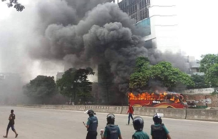 এরপর র্যাব ও পুলিশ শিক্ষার্থীদের ওপর লাঠিচার্জ শুরু করে। এতে শিক্ষার্থীরা আরও ক্ষুব্ধ হয়ে পড়ে এবং এনা পরিবহনের একটি বাস ভাঙচুর করে এবং আগুন ধরিয়ে দেয়। শেষ খবর পাওয়া পর্যন্ত আইনশঙ্খলা বাহিনী পরিস্থিতি নিয়ন্ত্রণের চেষ্টা করছে।