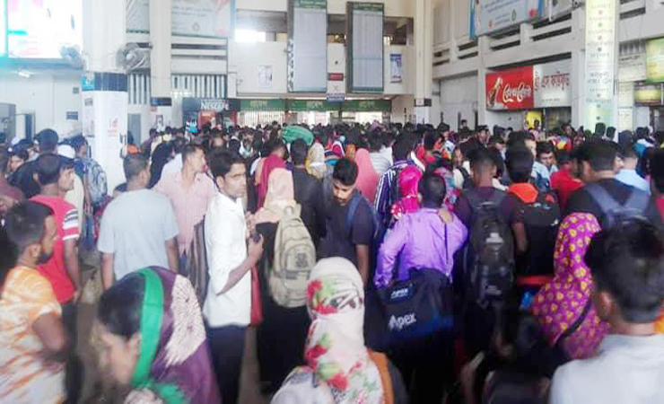 সোমবার সকাল থেকে রাজধানীর কমলাপুর ও বিমানবন্দর রেলস্টেশনে উপচেপড়া ভিড় দেখা গেছে। অনেকে ঝুঁকি নিয়েই ট্রেনের ছাদে করে যাচ্ছেন ফিরছেন স্ব-স্ব গন্তব্যে। তবে শিডিউল বিপর্যয়ে নির্ধারিত সময়ের চেয়েও দুই-তিন ঘণ্টা স্টেশনে অপেক্ষা করতে হচ্ছে যাত্রীদের। সবচেয়ে বেশি ভিড় উত্তরবঙ্গগামী ট্রেনগুলোতে।