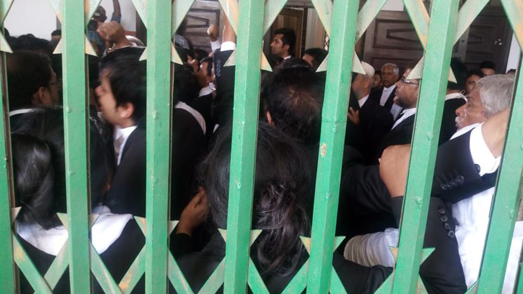 বিএনপিপন্থি আইনজীবীরা আদালত বর্জন করেছেন এবং তারা মামলার শুনানি করতে যাচ্ছেন না। অপরদিকে আওয়ামীপন্থি আইনজীবীরা এই বর্জনের প্রতিবাদ করছেন। তারা চেষ্টা করছেন আইনজীবী সমিতির দ্বিতীয় তলার তালা ভাঙার। এ সময় এক পক্ষ অন্য পক্ষকে দোষারোপ করে বিক্ষোভ করতে থাকেন।