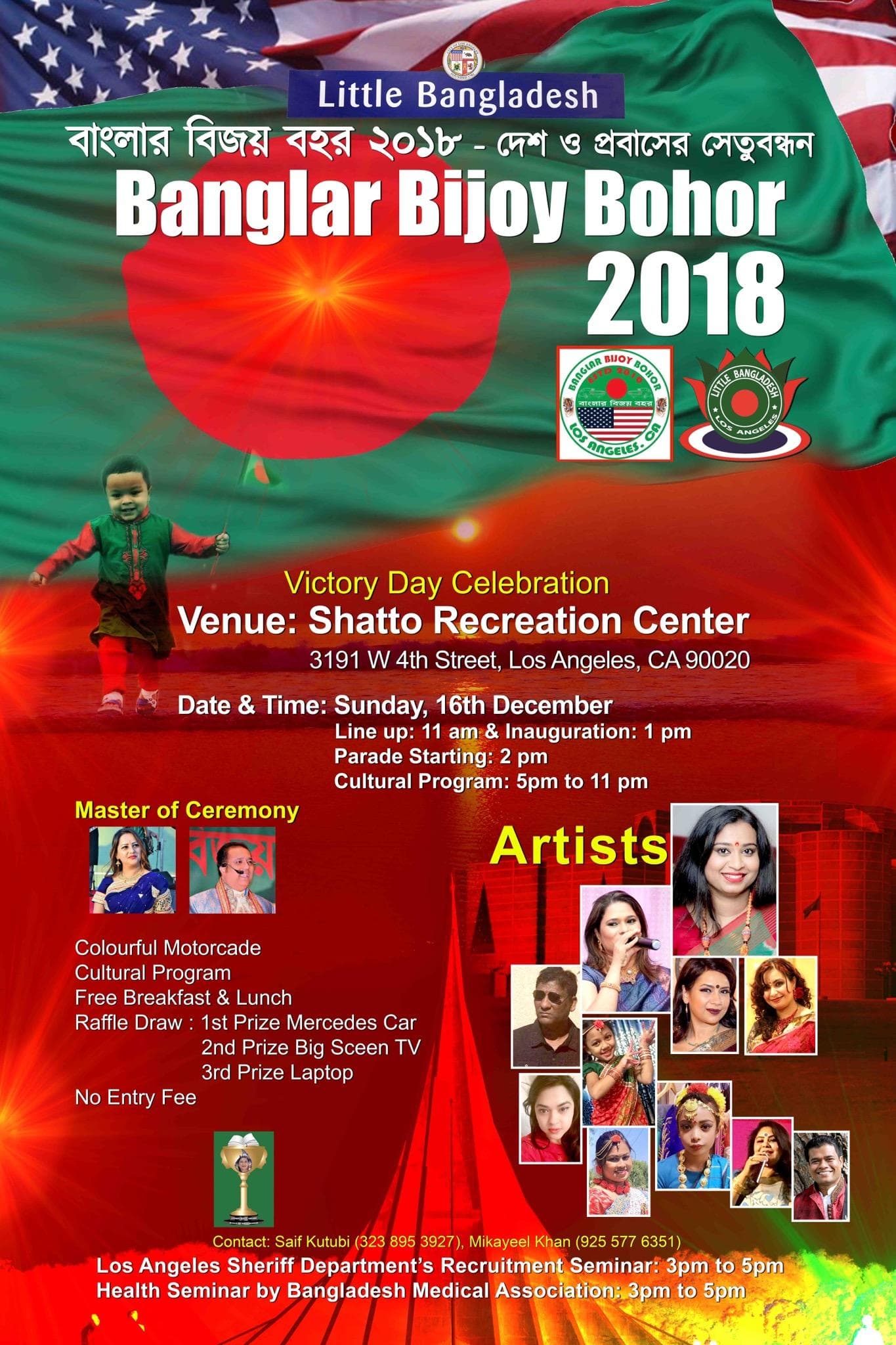 সাংস্কৃতিক অনুষ্ঠানের আগে বিকেল ৩টা থেকে ৫টা পর্যন্ত লস এঞ্জেলেস পুলিশ ডিপার্টমেন্ট ও বাংলাদেশ মেডিক্যাল এসোসিয়েশনের উদ্যোগে দুটি সেমিনার অনুষ্ঠিত হবে।