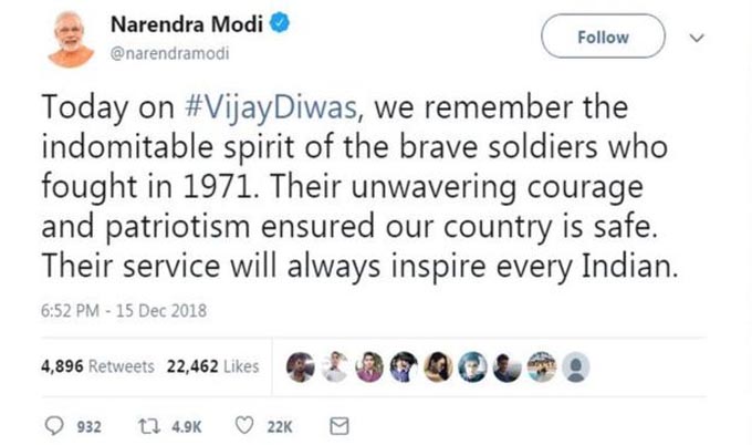 বিজয় দিবসে এই অর্জনকে গর্বের সঙ্গে স্মরণ করেছে ওই টুইট - এ কথাও মনে করিয়ে দেওয়া হয়েছে ভারত ৯০ হাজারেরও বেশি পাকিস্তানি সেনাকে যুদ্ধবন্দী করেছিল।