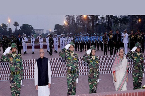 ফুল দিয়ে স্বাধীনতাযুদ্ধের বীর শহীদদের প্রতিশ্রদ্ধা জানিয়েছেন রাষ্ট্রপতি আবদুল হামিদ ওপ্রধানমন্ত্রী শেখ হাসিনা।১৯৭১ সালের এই দিনে পাকিস্তানি দখলদারবাহিনীর দমন অভিযানের বিরুদ্ধে রুখে দাঁড়িয়েস্বাধীনতা যুদ্ধে ঝাঁপিয়ে পড়েছিল পূর্বপাকিস্তানের বাঙালিরা। বরাবরের মতোইরাষ্ট্রীয়ভাবে দিনটিকে পালন করা হচ্ছে জাতীয়দিবস হিসাবে।বৃহস্পতিবার ভোর পৌনে ৬টার দিকে সাভারেজাতীয় স্মৃতিসৌধে ফুল দিয়ে জাতির শ্রেষ্ঠসন্তানদের প্রতি শ্রদ্ধা জানান রাষ্ট্রপতি আবদুলহামিদ ও প্রধানমন্ত্রী শেখ হাসিনা।সশস্ত্র বাহিনীর একটি চৌকস দল এ সময় গার্ড অবঅনার দেয়।এ সময় মন্ত্রিপরিষদের সদস্য, বিচারপতি, তিনবাহিনীর প্রধানসহ ঊর্ধ্বতন কর্মকর্তারা উপস্থিতছিলেন।পরে আওয়ামী লীগ সভানেত্রী হিসেবে দলীয়নেতাদের নিয়ে স্মৃতিসৌধে ফুল দেন শেখ হাসিনা।এরপরে স্মৃতিসৌধে ফুল দিয়ে একাত্তরেরশহীদদের প্রতি শ্রদ্ধা জানান জাতীয় সংসদেবিরোধী দলীয় নেতা রওশন এরশাদ।সকাল সোয়া ৬টার দিকে রাষ্ট্রপতি ওপ্রধানমন্ত্রী স্মৃতিসৌধ ত্যাগ করার পরমুক্তিযোদ্ধা সংসদ, বিদেশি কূটনীতিক, বিভিন্নরাজনৈতিক ও সামাজিক সংগঠনসহ সর্বস্তরেরজনগণের শ্রদ্ধা নিবেদন পর্ব শুরু হয়।সূর্য ওঠার আগেই সাধারণ মানুষ ভিড় জমাতে শুরুকরে জাতীয় স্মৃতিসৌধের সামনে। বেলা বাড়ারসঙ্গে বাড়তে থাকে এই ভিড়।