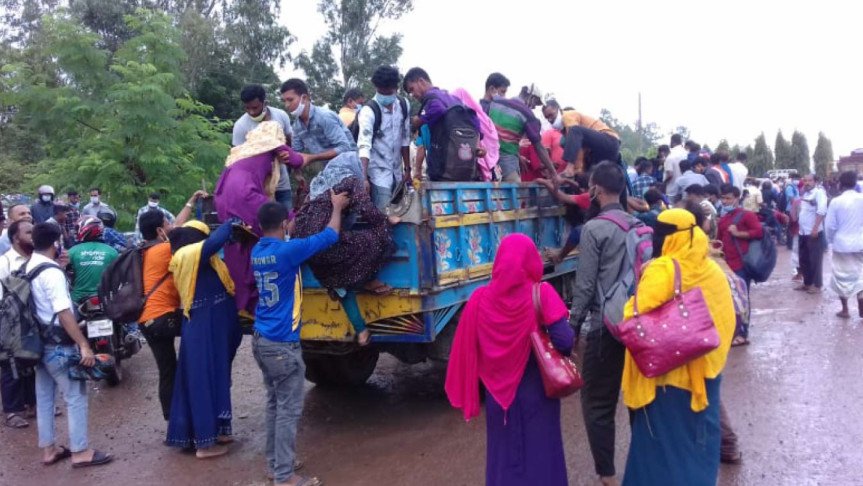 পোশাককর্মী মাহমুদুল হাসান বলেন, ‘কোরবানির ঈদে বাড়ি এসেছিলাম পরিবারের সঙ্গে ঈদ করার জন্য। রোববার থেকে গার্মেন্টস খুলবে—এই খবরে পোশাককর্মীরা কর্মস্থলে ফিরতে শুরু করেছেন। বাস বন্ধ থাকায় অতিরিক্ত ভাড়ায় বাধ্য হয়ে ট্রাকে করে ঢাকায় যাচ্ছি।’