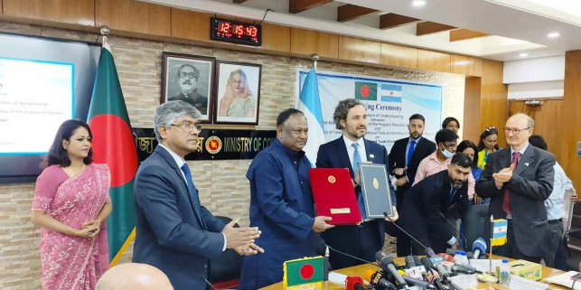 খাদ্য নিরাপত্তা নিশ্চিত করতে এবং দ্বিপাক্ষিক বাণিজ্য ও বিনিয়োগ বাড়াতে সমঝোতা স্মারক সই করেছে বাংলাদেশ ও আর্জেন্টিনা। মঙ্গলবার (২৮ ফেব্রুয়ারি) সকালে সচিবালয়ে বাণিজ্য মন্ত্রণালয়ে বাণিজ্যমন্ত্রী টিপু মুনশি এবং আর্জেন্টিনার পররাষ্ট্র ও আন্তর্জাতিক বাণিজ্যমন্ত্রী সান্তিয়াগো ক্যাফিয়েরো এ সমঝোতা স্মারক সই করেন।