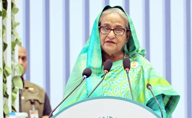 শেখ হাসিনা বলেন, বৈশ্বিক কার্বন নিঃসরণে আমাদের অবদান শূন্য দশমিক ৪৮ শতাংশের কম হলেও এর নেতিবাচক প্রভাবে সবচেয়ে বেশি ক্ষতিগ্রস্ত ও ঝুঁকিপূর্ণ দেশের মধ্যে বাংলাদেশ অন্যতম। জলবায়ু পরিবর্তনের এ বিরূপ প্রভাব সম্ভাব্য উন্নয়ন এবং অর্থনৈতিক সমৃদ্ধির জন্য হুমকি হিসেবে দেখা দিয়েছে। অব্যাহত বৈশ্বিক উষ্ণায়নের ফলে সমুদ্রতলের উচ্চতা বৃদ্ধি পাচ্ছে। ফলে বাংলাদেশের দক্ষিণ-পশ্চিমাংশের বিস্তীর্ণ অঞ্চল মোট আয়তনের প্রায় ১২ থেকে ১৭ শতাংশ এ শতাব্দীর শেষ দিকে সমুদ্রগর্ভে নিমজ্জিত হওয়ার ঝুঁকির মধ্যে রয়েছে।