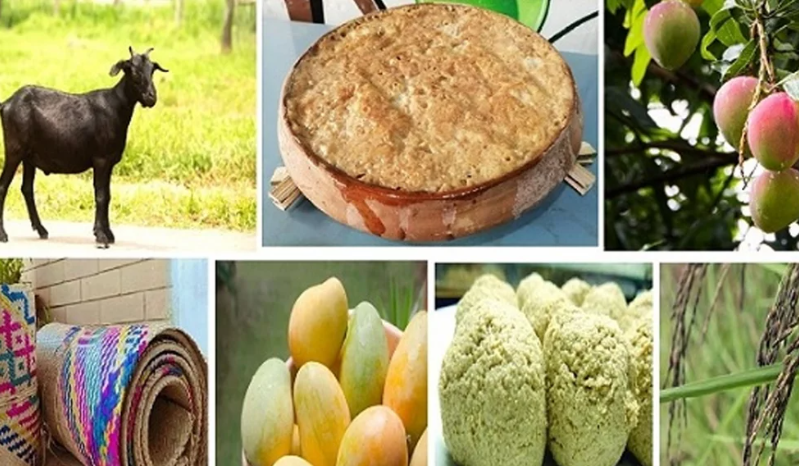 ঢাকার জামদানি, ঢাকাই মসলিন, টাঙ্গাইলের শাড়ি, পোড়াবাড়ির চমচম, মধুপুরের আনারস, নরসিংদীর অমৃতসাগর কলা, লটকন, গোপালগঞ্জের রসগোল্লা, ময়মনসিংহের মুক্তাগাছার মন্ডা, নেত্রকোনার বিজয়পুরের সাদামাটি, জামালপুরের নকশি কাঁথা, শেরপুরের তুলশিমালা ধান, কুমিল্লার রসমালাই, চাঁদপুরের ইলিশ, সিলেটের শীতল পাটি, মৌলভীবাজারের আগর, আগর আতর, বগুড়ার দই, রাজশাহীর মিষ্টি পান, রাজশাহী সিল্ক, রাজশাহী-চাঁপাইনবাবগঞ্জের ফজলি আম, চাঁপাইনবাবগঞ্জের খিরসাপাতি আম, চাঁপাইনবাবগঞ্জের ল্যাংড়া আম, চাঁপাইনবাবগঞ্জের আশ্বিনা আম, রংপুরের শতরঞ্জি, রংপুরের হাড়িভাঙা আম, দিনাজপুরের কাটারীভোগ, বাগেরহাটের বাগদা চিংড়ি, যশোরের খেজুর গুড়, চুয়াডাঙ্গার ব্ল্যাক বেঙ্গল ছাগল, কুষ্টিয়ার তিলের খাজা, ভোলার ইলিশ।