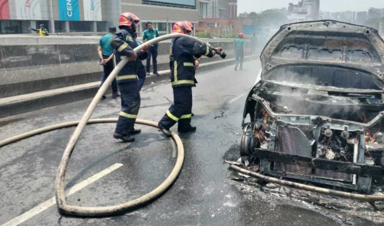 বিমানবন্দরের সামনের ফ্লাইওভারে একটি প্রাইভেটকারে হঠাৎ আগুন