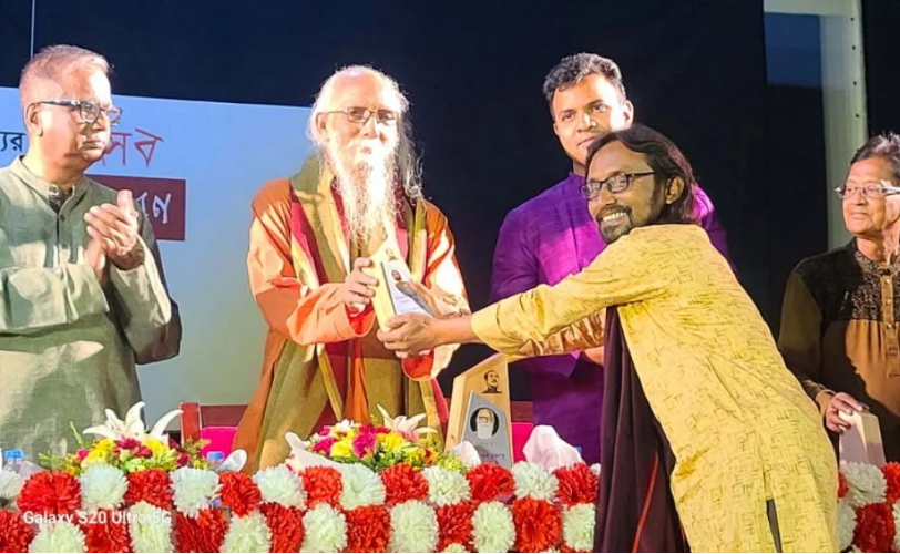 লোক সম্পাদক কবি অনিকেত শামীমের হাত থেকে শংসাপত্র ও অর্থগ্রহণ করেন কবি অতনু তিয়াস। ছবি: ইত্তেফাক