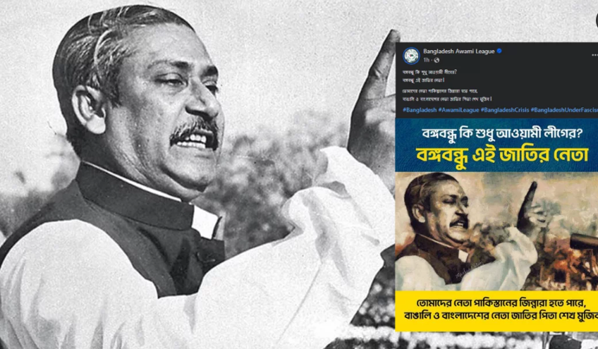 বঙ্গবন্ধু শেখ মুজিবুর রহমানকে জাতির পিতা মনে করে না বর্তমান সরকার- বুধবার (১৬ অক্টোবর) অন্তর্বর্তী সরকারের দুই উপদেষ্টার এমন মন্তব্য মোটেও বিষয়টি ভালোভাবে নেয়নি আওয়ামী লীগ। জবাবে নিজেদের অবস্থান স্পস্ট করেছে দলটি। বৃহস্পতিবার (১৭ অক্টোবর) দলের ফেরিফাইড ফেসবুক পেজ থেকে বঙ্গবন্ধুর ৭ মার্চের ভাষণের একটি ছবি শেয়ার করা হয়। এর ক্যাপশন অংশে লেখা হয়, বঙ্গবন্ধু কি শুধু আওয়ামী লীগের? বঙ্গবন্ধু এই জাতির নেতা। তোমাদের নেতা পাকিস্তানের জিন্নারা হতে পারে, বাঙালি ও বাংলাদেশের নেতা জাতির পিতা শেখ মুজিব।