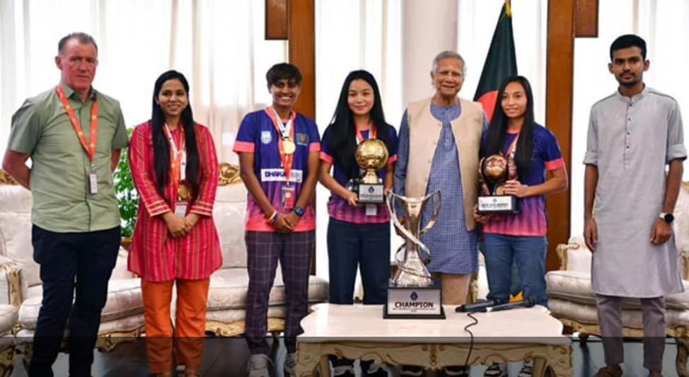 গত ৩০ অক্টোবর কাঠমান্ডুতে সপ্তম সাফ নারী চ্যাম্পিয়নশিপের ফাইনালে নেপালকে ২-১ গোলে পরাজিত করে শিরোপ জিতে নেয় বাংলাদেশ দল। তাদের উদ্দেশে প্রধান উপদেষ্টা বলেন এই সাফল্যের জন্য আমি পুরো জাতির পক্ষ থেকে তোমাদেরকে অভিনন্দন জানাই। জাতি তোমাদের প্রতি কৃতজ্ঞ। আমাদের দেশের মানুষ সাফল্য চায়, আর তোমরা সেই সাফল্য এনে দিয়েছ।