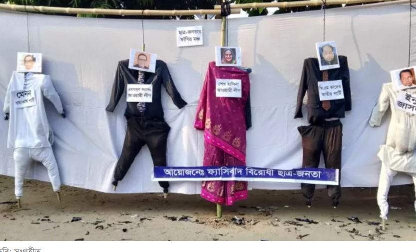 সাবেক প্রধানমন্ত্রী শেখ হাসিনা, ওবায়দুল কাদের, হাসানুল হক ইনু, রাশেদ খান মেননসহ আওয়ামী লীগের বিভিন্ন নেতাকর্মীদের শাস্তির দাবিতে প্রতীকী ফাঁসির মঞ্চ তৈরি করেছে ‘ফ্যাসিবাদ বিরোধী ছাত্র-শ্রমিক-জনতা সংগঠন’।