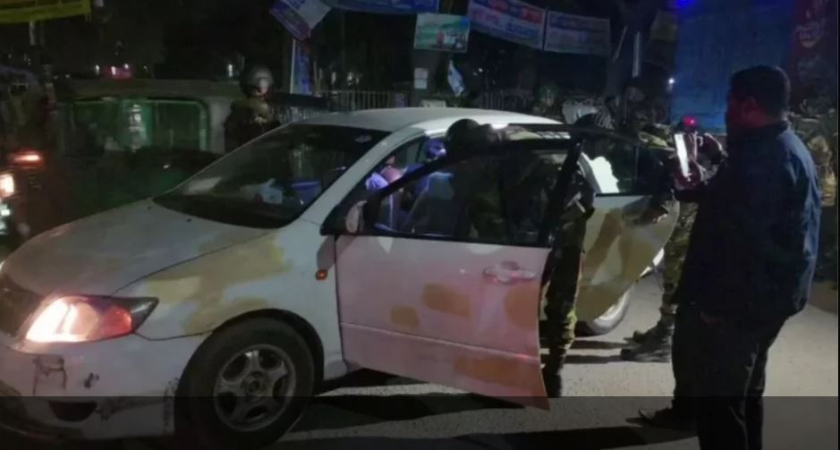 গাজীপুর জেলা প্রশাসকের অফিসের সামনে চেকপোস্ট বসিয়ে মোটরসাইকেলসহ সড়কে বিভিন্ন গাড়ি থামিয়ে তল্লাশি চালান সেনা সদস্যরা।