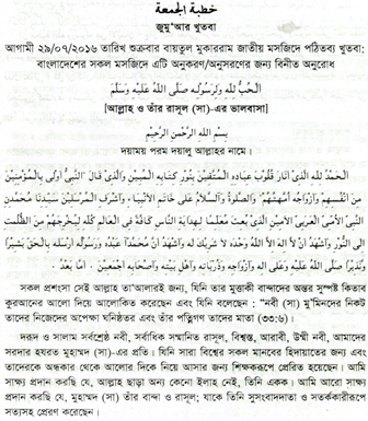 আগামীকাল শুক্রবার বায়তুল মুকাররম জাতীয় মসজিদে পঠিতব্য জুমার খুতবা দেশের মসজিদগুলোতে পাঠানো হয়েছে। প্রেরিত খুতবাটি দেশের সকল মসজিদের খতীবগণকে অনুসরণ করতে বলেছে ইসলামিক ফাউন্ডেশন।