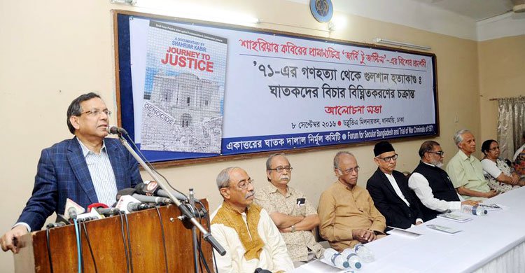 ’৭১-এর গণহত্যা থেকে গুলশান হত্যাকাণ্ড বিচার বিঘ্নিতকরণের চক্রান্ত’ শীর্ষক এই আলোচনা সভায় প্রধান অতিথির বক্তব্যে আইনমন্ত্রী যুদ্ধাপরাধীদের সন্তানদের বিরুদ্ধেও যুদ্ধ চালিয়ে যাওয়ার আহ্বান জানান।