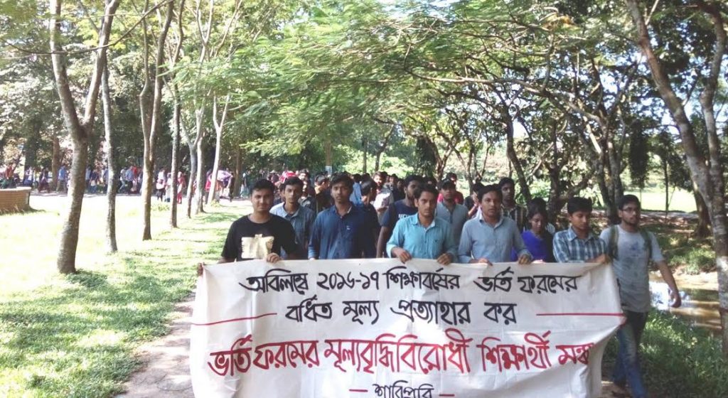 ক্যাম্পাস সূত্র জানায়, রোববার সকাল ১২ টায় বিশ্ববিদ্যালয়ের কেন্দ্রীয় গ্রন্থাগার ভবনের সামনে মানববন্ধন শেষে বিক্ষোভ মিছিলটি ক্যাম্পাসের বিভিন্ন সড়ক প্রদক্ষিণ করে। মিছিলে “ অর্থ যার শিক্ষা তার এই নীতি মানি না, ফরমের দাম বাড়ল কেন প্রশাসন জবাব চাই, শিক্ষা না বানিজ্য, শিক্ষা শিক্ষা” শ্লোগান তুলে। পরে তারা প্রশাসনিক ভবন-২ এর সামনে গিয়ে অবস্থান কর্মসূচি পালন করে। কর্মসূচীতে বিশ্ববিদ্যালয়ের বিভিন্ন সামজিক, সাংস্কৃতিক, স্বেচ্ছাসেবী সংগঠন ও সম্মিলিত সাংস্কৃতিক জোটের সাবেক ও বর্তমান নেতাকর্মী, প্রগতিশীল ছাত্রজোটসহ প্রায় অর্ধ সহ¯্রাধিক শিক্ষার্থীরা উপস্থিত ছিলেন। অবস্থান কর্মসূচি থেকে তারা ভিসি ড. আমিনুল হক ভূইয়া বরাবর একটি স্মারক লিপি প্রদান করেন। এসময় উপাচার্য শিগগির একাডেমিক কাউন্সিলের বৈঠক করে সিদ্ধান্ত নিবেন বলে আন্দোলনকারী শিক্ষার্থীদের জানান।