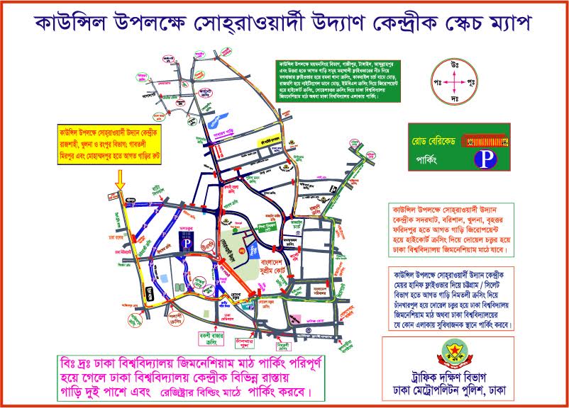 ২২ ও ২৩ অক্টোবর সকাল সাতটা থেকে ডাইভারশন শুরু হবে। এ জন্য মানিক মিয়া অ্যাভিনিউ-ফার্মগেট অভিমুখে কোনো গাড়ি আসবে না এবং রাসেল স্কয়ার-পান্থপথ অভিমুখে কোনো গাড়ি যাবে না। সব গাড়ি নিউমার্কেট-সায়েন্স ল্যাবরেটরি-নিউমার্কেট-আজিমপুর-পলাশী-জগন্নাথ হল ক্রসিং হয়ে ঢাকা বিশ্ববিদ্যালয় এলাকায় পার্কিংয়ে প্রবেশ করবে অথবা নিউমার্কেট-নীলক্ষেত-ফুলার রোড দিয়ে ঢাকা বিশ্ববিদ্যালয়ে প্রবেশ করবে। কাঁটাবন থেকে কোনো গাড়ি শাহবাগের দিকে আসবে না। কাঁটাবন থেকে ডানে মোড় নিয়ে নীলক্ষেত ক্রসিং হয়ে ঢাকা বিশ্ববিদ্যালয় এলাকায় প্রবেশ করবে। টিএসসি থেকে দোয়েল চত্বর ও দোয়েল চত্বর থেকে টিএসসি কোনো গাড়ি প্রবেশ করবে না। শাহবাগ থেকে মৎস্য ভবন এবং মৎস্য ভবন থেকে শাহবাগ অভিমুখে কোনো গাড়ি প্রবেশ করবে না।