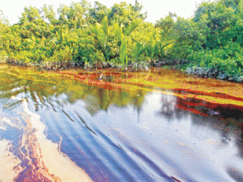 সুন্দরবনের শ্যালা নদীর মৃগমারী এলাকা। পানিতে কালো তেলের স্তর। গতকাল দুপুর ১২টায় ছবিটি তুলেছেন এহসান উদ্দৌলাতেলের দূষণ নিয়ন্ত্রণে চট্টগ্রাম থেকে আসা জাহাজ কান্ডারি-১০ ব্যবহার করা হবে কি না, জানতে চাইলে শামসুদ্দোহা বলেন, তেল সংগ্রহের কাজ আগামী তিন দিন পর্যন্ত চলবে। এরপর স্থানীয় প্রশাসনের কর্মকর্তারা পরবর্তী সিদ্ধান্ত নেবেন। আলোচনা চলাকালে সুন্দরবনের পূর্ব বিভাগীয় বন কর্মকর্তা আমীর হোসাইন চৌধুরী বলেন, কান্ডারি কাজ করার আগে পরিবেশ ও বন মন্ত্রণালয়ের অনুমতি নেওয়া দরকার। তিনি প্রশ্ন তোলেন, যদি রাসায়নিক ব্যবহারে বিরূপ প্রভাব পড়ে, তাহলে কী হবে? এ সময় শামসুদ্দোহা স্থানীয়ভাবে ফোমের মাধ্যমে তেল সংগ্রহ করার প্রস্তাব দেন। জাহাজটি যেখানে ডুবেছে সেই চ্যানেলের ছোট খালগুলো জাল দিয়ে প্রতিরোধ করা হয়েছে বলে জানিয়েছেন সুন্দরবনের পূর্ব বিভাগীয় বন কর্মকর্তা আমীর হোসাইন চৌধুরী।