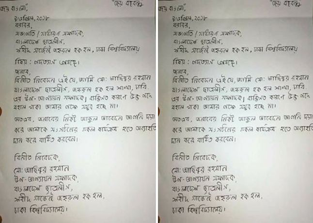 পদত্যাগের ঘোষণা দেওয়া নেতারা হলেন- ঢাকা বিশ্ববিদ্যালয়ের বিজনেস অনুষদের ট্যুরিজম এন্ড হসপিটালিটি ম্যানেজমেন্ট বিভাগ ছাত্রলীগের সাধারণ সম্পাদক সাইফুল্লাহ সাইফ, শহীদ সার্জেন্ট জহরুল হক শাখা ছাত্রলীগের উপ-অ্যাপায়ন বিষয়ক সম্পাদক অছিবুর রহমান, ফলিত পরিসংখ্যান বিভাগ ছাত্রলীগের সাধারণ সম্পাদক শরীফ হাসান সুজন।