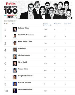 ২০১৩ সালের ১ অক্টোবর থেকে ২০১৪ সালের ৩০ সেপ্টেম্বর সময়কালে তারকাদের আয় ও খ্যাতি বিবেচনায় এই তালিকা তৈরি করা হয়েছে। পারিশ্রমিক ও খ্যাতি- এই দুই ক্যাটাগরিতে একেকজন তারকার অবস্থান বিচার করে মূল তালিকায় স্থান নির্ধারণ হয়। এবারও বলিউডের অভিনয়শিল্পী ছাড়াও তালিকায় আছেন গায়ক, পরিচালক, খেলোয়াড়, সাহিত্যিকরা। সবাইকে সব হিসেবে ছাড়িয়ে গেছেন সল্লুবাবা। এ বছরে মুক্তি পেয়েছে তার দুটি ছবি- 'জয় হো' ও 'কিক'। টেলিভিশন রিয়েলিটি শো 'বিগ বস' সঞ্চালনা করেও বছরজুড়ে ছিলেন আলোচনায়। ২০১৪ সালে সালমান আয় করেছেন ২৪৪ কোটি ৫০ লাখ রুপি। এই সময়কালে কোনো সিনেমা মুক্তি না পাওয়ায় আয়ের হিসেবে পিছিয়ে পড়েছেন শাহরুখ খান। ২০২ কোটি ৪০ লাখ রুপি আয় নিয়ে পারিশ্রমিকের হিসেবে দ্বিতীয় অবস্থানে আছেন তিনি। তবে খ্যাতি ক্যাটাগরিতে সাত নম্বরে নেমে যাওয়ায় মূল তালিকার তিনে নেমে গেছেন তিনি।আবার পারিশ্রমিক ক্যাটাগরির তিন নম্বরে থেকেও মূল তালিকায় দ্বিতীয় স্থান পেয়েছেন অমিতাভ বচ্চন। কারণ জনপ্রিয়তার হিসেবে চার নম্বরে ছিলেন তিনি। তার আয় ১৯৬ কোটি ৭৫ লাখ রুপি। জনপ্রিয়তার তালিকায় বিরাট কোহলির অবস্থান দুই। ভারতের জাতীয় দলের এই তারকা চলতি বছরে ৫৮ কোটি ৪৩ লাখ রুপি আয় করে পারিশ্রমিক তালিকায় আছেন ১২ নম্বরে। সমন্বিত তালিকায় ছয়ে জায়গা হয়েছে তার।চার ও পাঁচ নম্বর অবস্থানে আছেন যথাক্রমে ক্রিকেট তারকা মহেন্দ্র সিং ধোনি (১৪১ কোটি ৮০ লাখ রুপি) ও বলিউড তারকা অক্ষয় কুমার (১৭২ কোটি রুপি)।পারিশ্রমিক ও জনপ্রিয়তা- দুই ক্যাটাগরিতেই অস্টম স্থানে থাকা আমির খান মূল তালিকার সপ্তম ব্যক্তি। তিনি আয় করেছেন ৮০ কোটি ৪৭ লাখ রুপি। শীর্ষ দশে স্থান পাওয়া একমাত্র নারী- দীপিকা পাড়ুকোন। আয় করেছেন ৬৭ কোটি ২০ লাখ রুপি। জনপ্রিয়তায় তিনি পঞ্চম। পারিশ্রমিক ক্যাটাগরিতে নবম। মূল তালিকায় দীপকার স্থান আট নম্বরে। নবম স্থানে আছেন হৃত্বিক রোশন (৮৫ কোটি)। ১০ নম্বরে শচীন টেন্ডুলকার (৫৯ কোটি ৫৪ লাখ রুপি)।