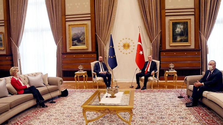 এপ্রিলের ৭ তারিখ ইউরোপীয় কাউন্সিলের প্রধান চার্লস মিশেল এবং ভন ডের লেয়েন রাষ্ট্রীয় সফের তুরস্কে এসে এরদোগানের সঙ্গে বৈঠক করেন। সে বৈঠকে এরদোগান এবং চার্লস মিশেল পাশাপাশি চেয়ারে বসেন আর ভন ডের লেয়েনের এবং তুরস্কের পররাষ্ট্রমন্ত্রী মেভলুত চাভুসওগলু মুখোমুখি সোফায় বসেন।