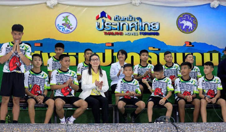 ১৯ দিন গুহায় আটকে থাকা থাইল্যান্ডের ১২ কিশোর ও তাদের ফুটবল কোচ প্রথমবারের মতো জনসম্মুখে হাজির হয়েছেন। বুধবার বিকেলে উত্তরাঞ্চলীয় প্রদেশে চিয়াং রাইতে জাতীয় সম্প্রচার মাধ্যমে হাজির হন তারা।