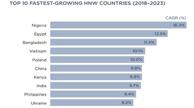 ধনী জনগোষ্ঠী বৃদ্ধি পাওয়ার ক্ষেত্রে বাংলাদেশের পাশাপাশি আর মাত্র চারটি দেশ দুই অঙ্কের প্রবৃদ্ধি অর্জন করেছে। সেগুলো হলো- নাইজেরিয়া (১৬ দশমিক ৩ শতাংশ), মিসর (১২ দশমিক ৫ শতাংশ), ভিয়েতনাম (১০ দশমিক ১ শতাংশ) ও পোল্যান্ড (১০ শতাংশ)।