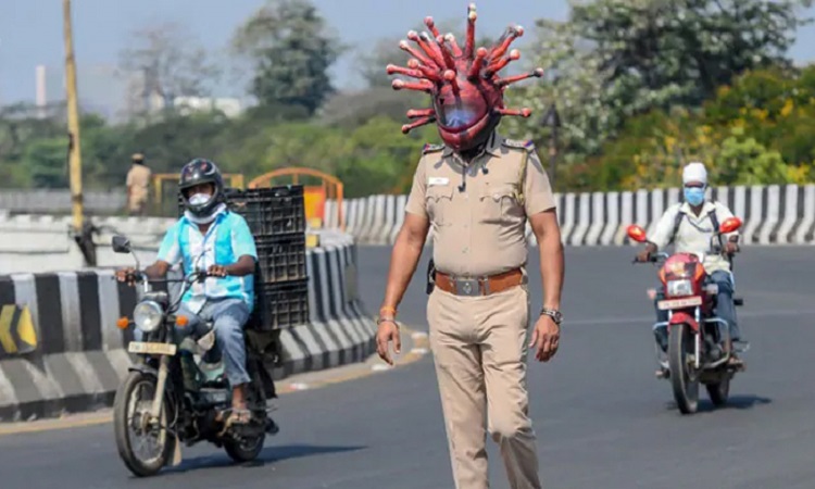 মাথায় করোনা ভাইরাস নিয়ে রাস্তায় পুলিশ