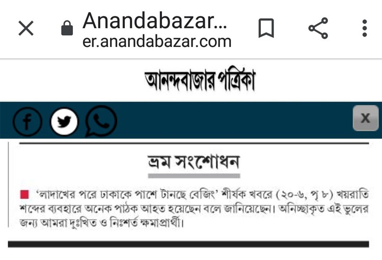 আনন্দবাজার পত্রিকা লিখেছে-‘লাদাখের পরে ঢাকাকে পাশে টানছে বেজিং’ শীর্ষক খবরে(২০-৬, পৃ ৮) খয়রাতি শব্দের ব্যবহারে অনেক পাঠক আহত হয়েছেন বলে জানিয়েছেন। অনিচ্ছাকৃত এই ভুলের জন্য আমরা দু:খিত ও নি:শর্ত ক্ষমাপ্রার্থী।’