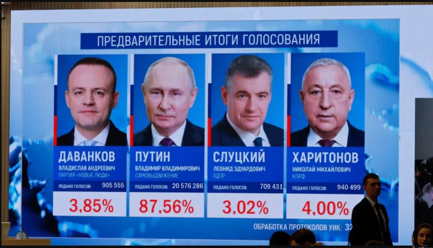 রাশিয়ার নির্বাচন কমিশন জানিয়েছে, অন্তত ৩০ শতাংশ ভোট গণনা সম্পন্ন হয়েছে। এর মধ্যে ভ্লাদিমির পুতিন পেয়েছেন ৮৭ দশমিক ৬৮ শতাংশ।
