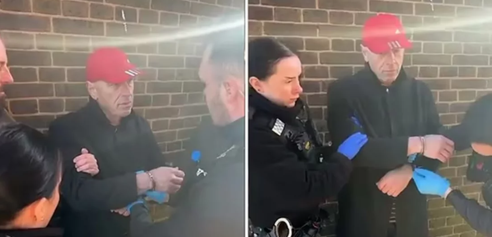 সামাজিক যোগাযোগ মাধ্যমে ছড়িয়ে পড়া ভিডিওতে দেখা যায়, উজ্জ্বল লাল রঙের ক্যাপ মাথায় কালো টি-শার্ট পরিহিত ৬৬ বছর বয়সী ওই ব্যক্তিকে দুই পুলিশ কর্মকর্তা ঘিরে আছেন। তার হাতে হাতকড়া দেখা যায়।