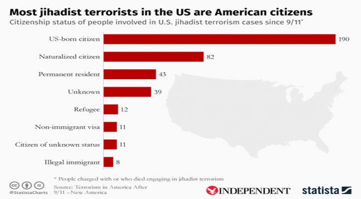 টেররিজম ইন আমেরিকা আফটার ৯/১১ নামে একটি সংগঠন জানিয়েছে, যুক্তরাষ্ট্রে জন্ম নেওয়া ১৯০ জন নাগরিক ২০০১ সাল থেকে নিয়ে এ পর্যন্ত দেশের মাটিতে সন্ত্রাসী হামলা চালিয়ে নিহত হয়েছে অথবা তাদের বিরুদ্ধে সন্ত্রাসবাদের অভিযোগ আনা হয়েছে। এর বাইরে শরণার্থী রয়েছে ১২ জন আর অবৈধ অভিবাসী রয়েছে মাত্র আটজন।