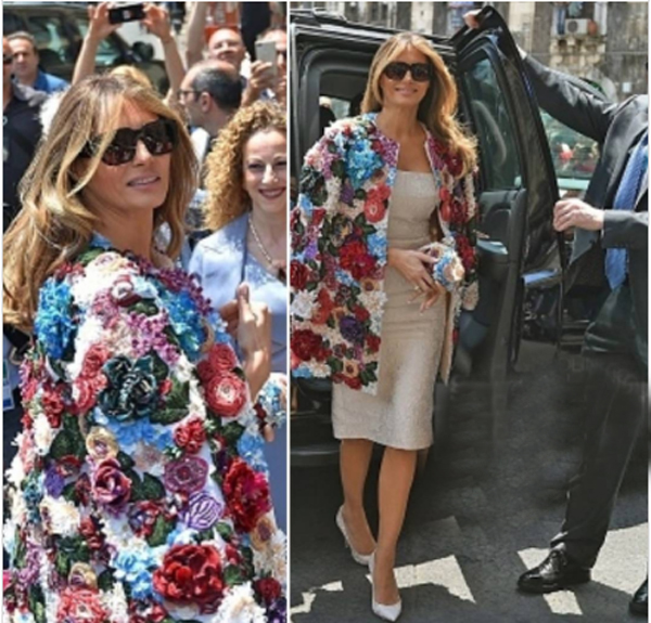 জি সেভেন বৈঠকে যোগ দিতে এসে মার্কিন ফার্স্ট লেডি মেলানিয়া ট্রাম্প যে ডিজাইনার কোটটি পরেছেন, তাতে সবার মাথা ঘুরে গিয়েছে।