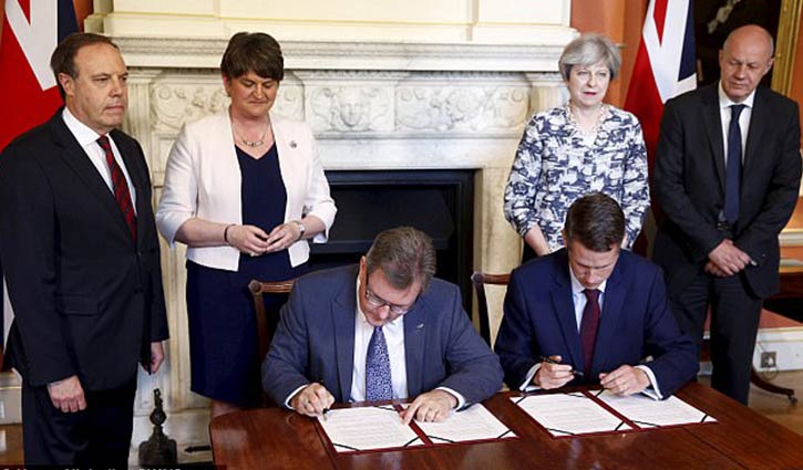 সোমবার লন্ডনের ডাউনিং স্ট্রিটে এ চুক্তি স্বাক্ষর হয়। বিবিসি জানিয়েছে, এ চুক্তির ফলে ফলে পার্লামেন্টে ডিইউপির ১০ এমপির ভোট এখন থেরেসা মে’র পক্ষে যাবে। ডিইউপি’র এমপিরা পার্লামেন্টে মে’র সংখ্যালঘু সরকারকে সমর্থন দিবেন।