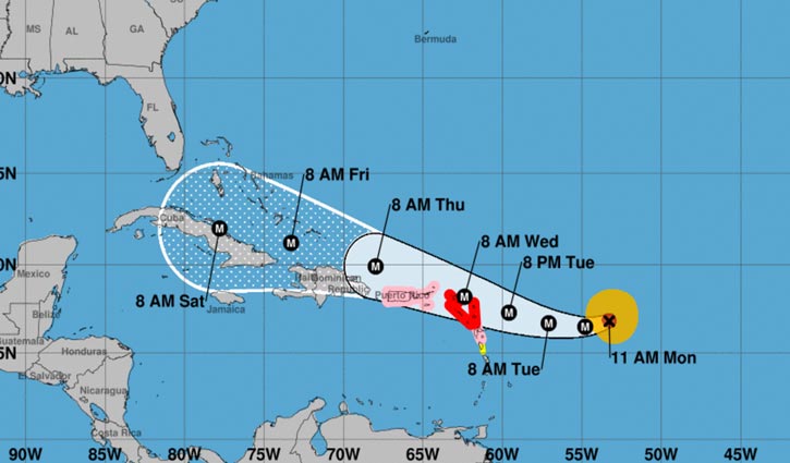 যুক্তরাষ্ট্রের ন্যাশনাল হারিকেন সেন্টার জানিয়েছে, ঘূর্ণিঝড়টির চোখ স্থানীয় সময় ভোর ৫টার দিকে বারবুডা থেকে সেন্ট মার্টিন দ্বীপের দিকে মোড় নেয়। ক্যাটাগরি ৫-এর ঘূর্ণিঝড়টি এখন তীব্র গতি নিয়ে পুয়ের্তে রিকো, ভার্জিন আইল্যান্ড, ডমিনিকান রিপাবলিক ও হাইতির যৌথ অঞ্চল হিসপানিওলা এবং কিউবার দিকে অগ্রসর হচ্ছে। ক্যারিবীয় অঞ্চলের বাসিন্দারা বন্যা হতে পারে এমন এলাকা থেকে সরে যাওয়ার চেষ্টা করছেন। ওই সব এলাকার বাসিন্দারা সম্ভাব্য দুর্যোগ পরিস্থিতি মোকাবেলা বাড়িতে পানি, খাদ্য ও জ্বালানি মজুদ করে রেখেছেন। প্রেসিডেন্ট ডোনাল্ড ট্রাম্প ইতিমধ্যে ফ্লোরিডা, পুয়ের্তে রিকো ও ভার্জিন আইল্যান্ডে জরুরি অবস্থা ঘোষণা করেছেন।