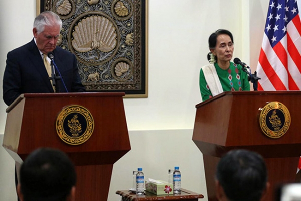 সেনাদের সঙ্গে ক্ষমতা ভাগাভাগি করে দুই বছরেরও কম সময় আগে দায়িত্ব নেওয়া মিয়ানমারের বেসামরিক প্রশাসনের প্রধান তথা কার্যত নেতা অং সান সু চির সঙ্গে যৌথ সংবাদ সম্মেলনে রোহিঙ্গাদের ওপর নৃশংসতায় উদ্বেগ প্রকাশ করেন টিলারসন। তিনি বলেন, ‘রাখাইন রাজ্যে সাম্প্রতিক সহিংসতার সময় মিয়ানমারের আইনশৃঙ্খলা বাহিনী ও দোসরদের (যাদের নিয়ন্ত্রণ করেনি আইনশৃঙ্খলা বাহিনী) ব্যাপক নৃশংসতার বিশ্বাসযোগ্য বহু খবরে আমরা গভীরভাবে উদ্বিগ্ন।’