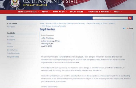 বৃহস্পতিবার (১২ এপ্রিল) মার্কিন প্রেসিডেন্টের পক্ষে ভারপ্রাপ্ত পররাষ্ট্রমন্ত্রী জন জে. সুলিভান এক বিবৃতিতে এই শুভেচ্ছা জানিয়েছেন।