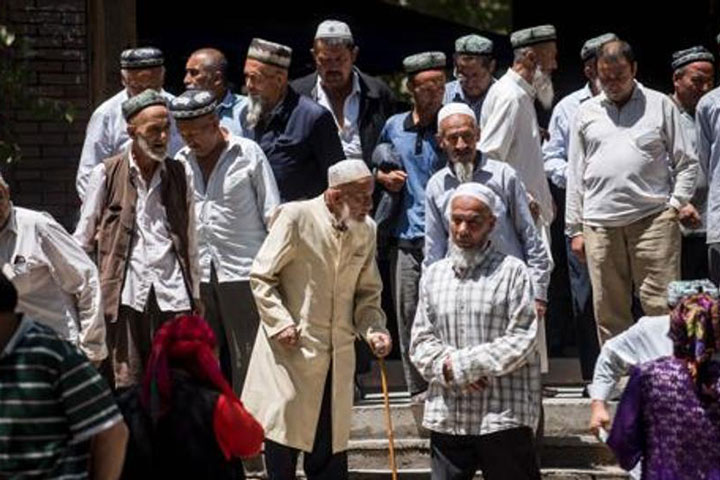 চীনের স্বায়ত্তশাসিত উইঘর অঞ্চলের হোটানের জুমা নামাজের পর স্থানীয়রা মসজিদ থেকে বের হচ্ছেন