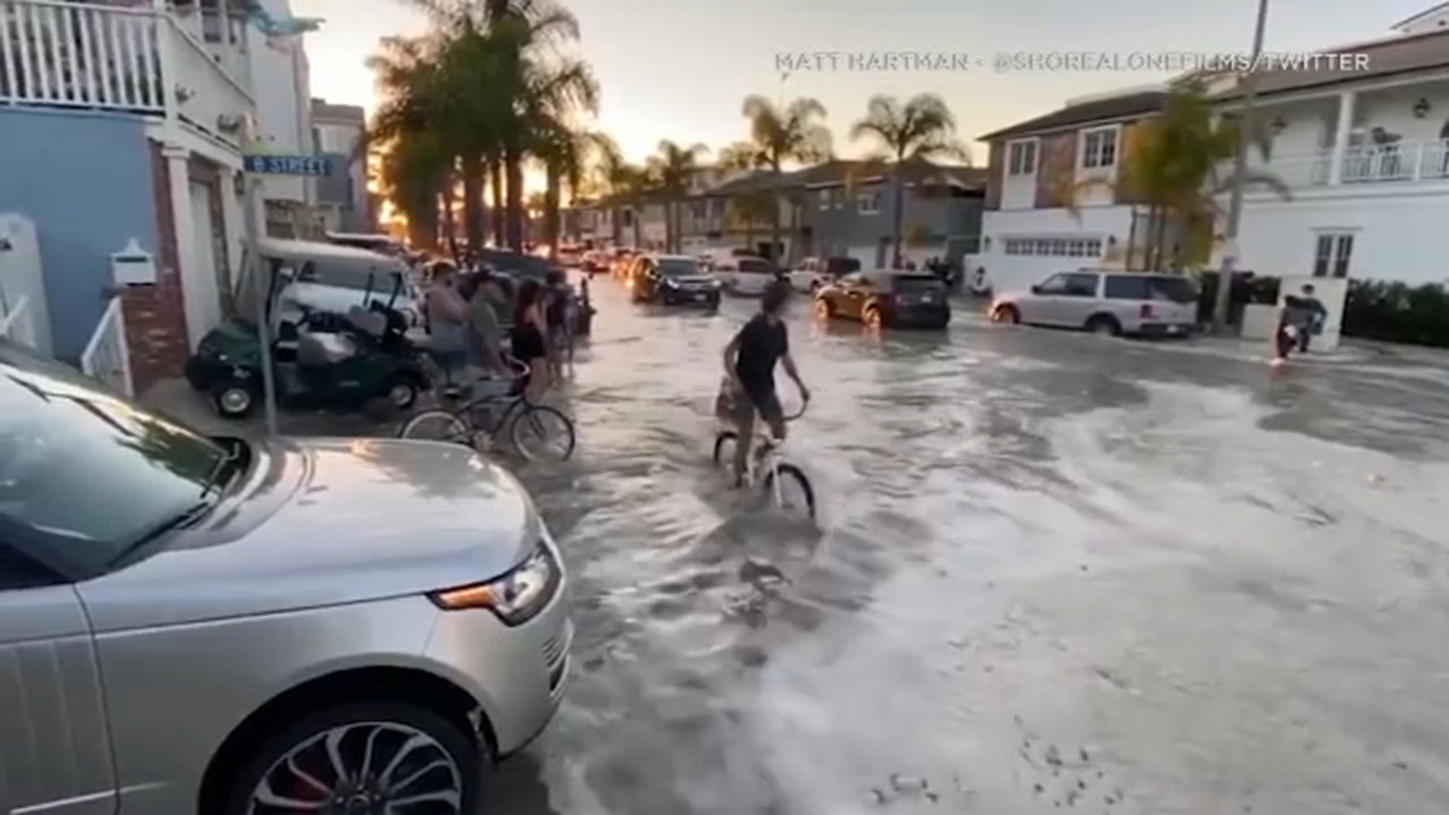 উঁচু ঢেউ ও জোয়ারের কারণে নিউপোর্ট বিচের বেলবোয়া পিনিনসোলা এলাকার রাস্তা প্লাবিত হয়েছে। এরিয়াল ফুটেজে দেখা যায়, প্লাবনের মধ্যেও বেলবোয়া পিয়ার পার্কে এবং পিনিনসোলার রাস্তায় গাড়ি ছিলো। পার্কিং লটে হাঁটু পরিমাণ পানি উঠেছিলো। সিটি কর্মীরা রাত ১১ টার দিকে ট্রাকটার ব্যবহার করে বালি সরাচ্ছেন যেন আটকা পড়া গাড়ি গুলো সরে যেতে পারে।